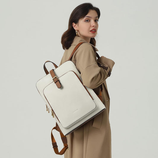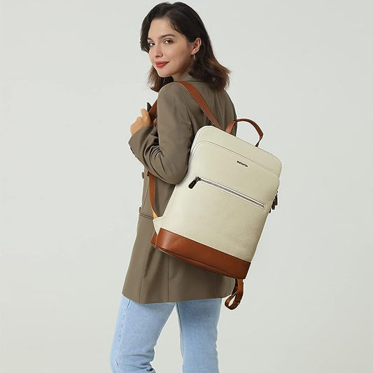 BOSTANTEN Leather Laptop Backpack Women 15.6 inch Computer Backpack Travel Business Shoulder Bags Vintage Casual Daypack Beige&Brown