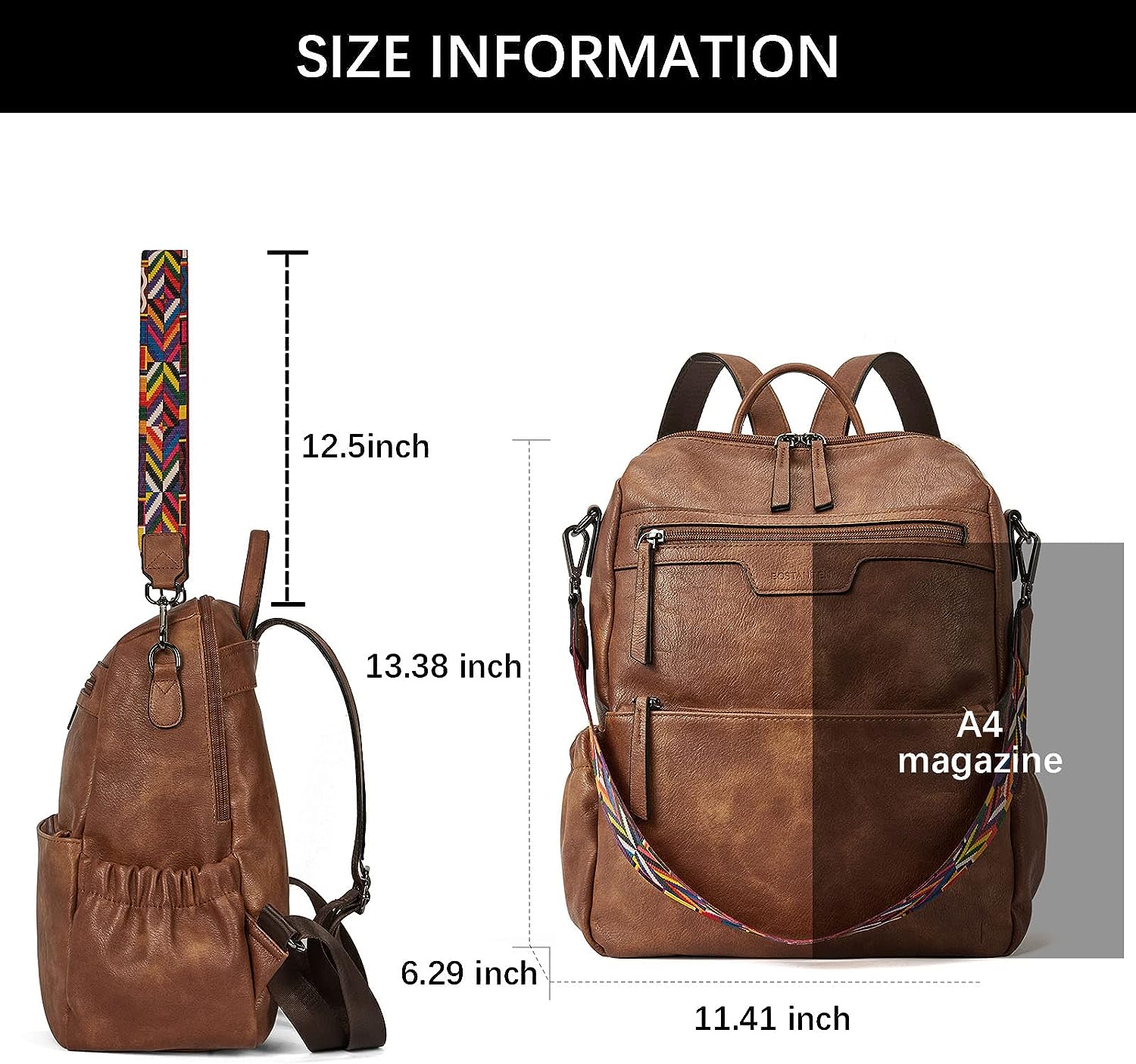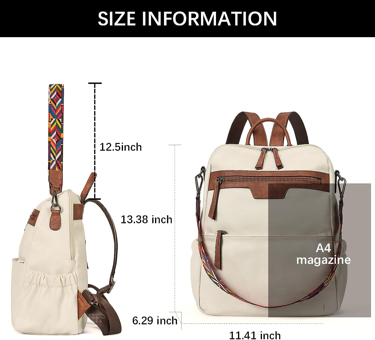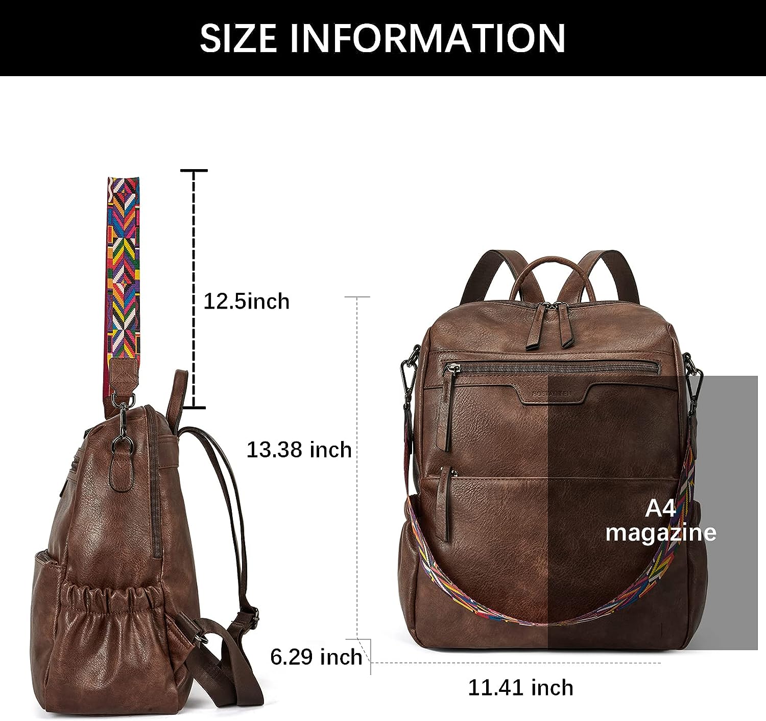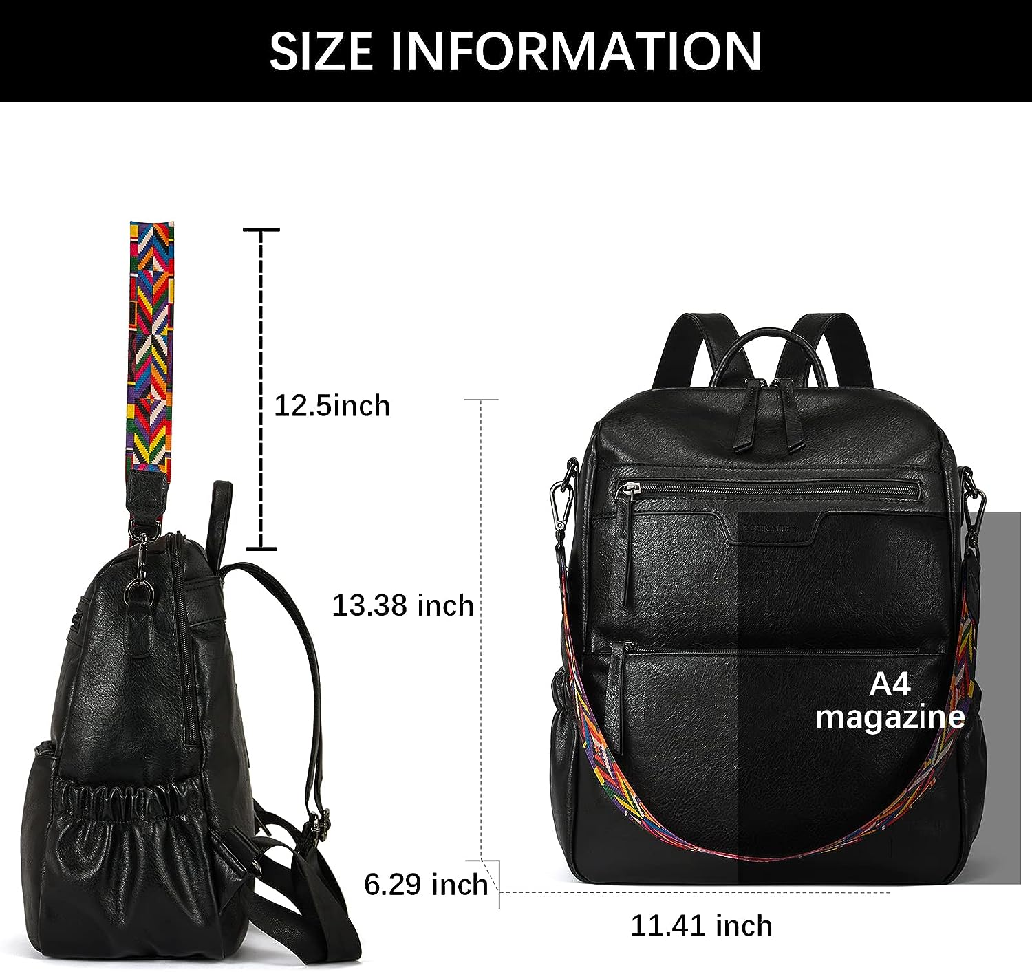 - SIZE: (L) 11.41 x (W) 6.29 x (H) 13.38 inches. Weight: 1.87 pounds. Adjustable back straps: 37"(longest size). Handle drop: 3.35". Detachable shoulder strap: 12.50". You can easily fit a 14-inch laptop, office papers, cell phones, water bottles, clothes, and your daily items into this women backpack purse.