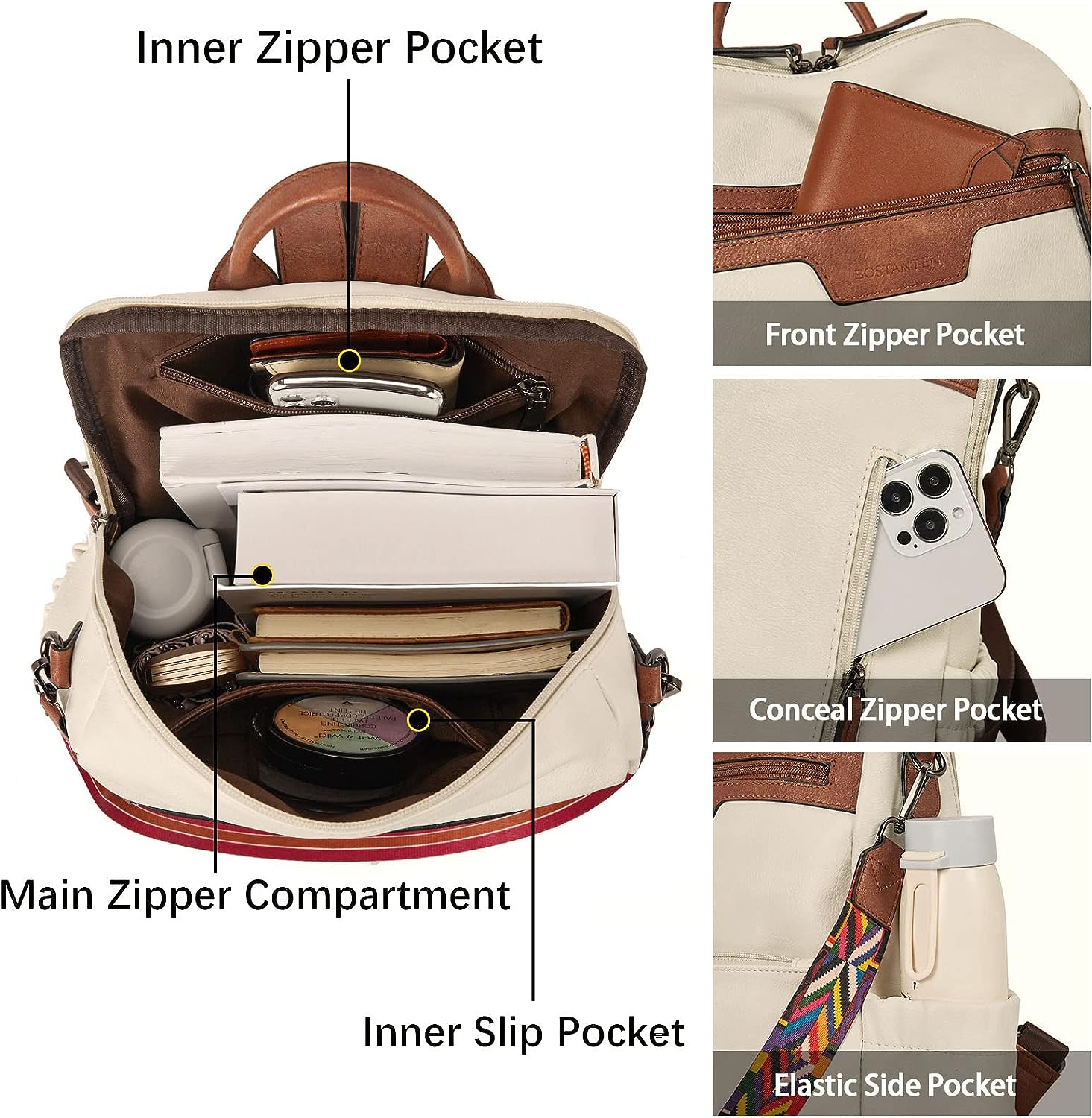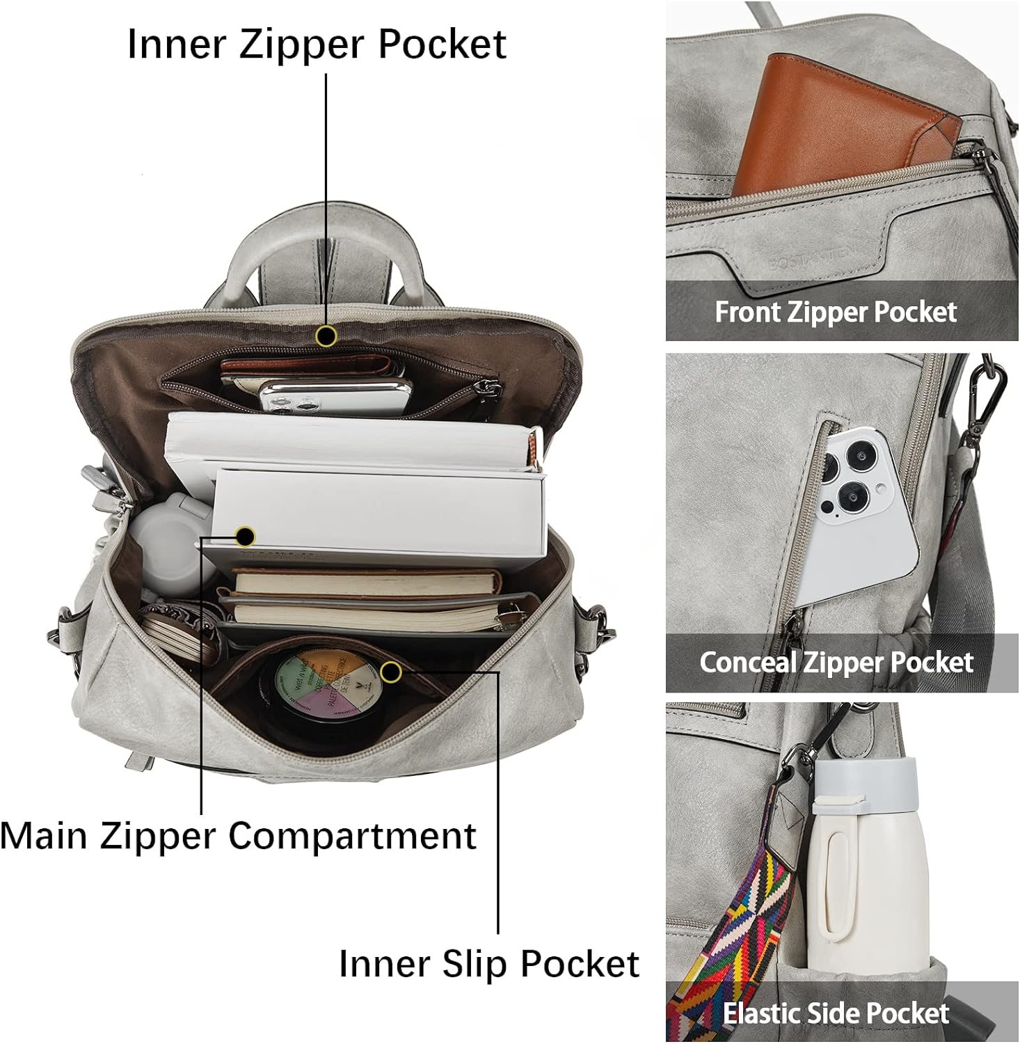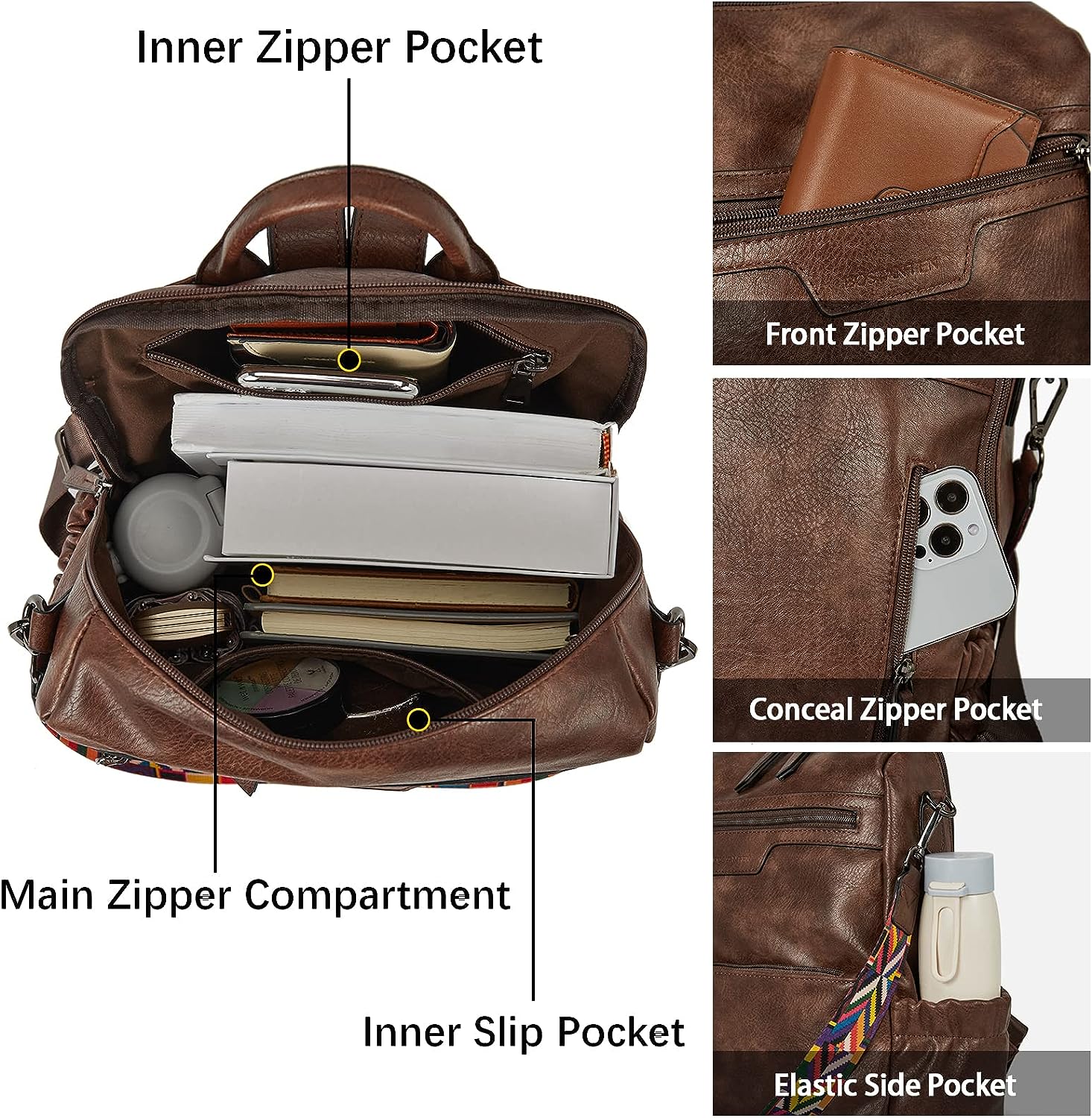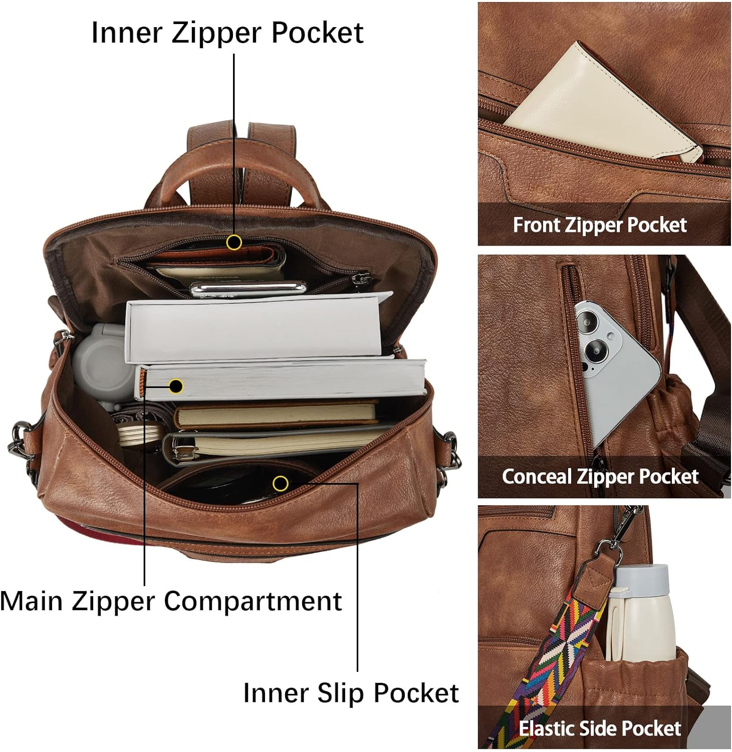 - STRUCTURE: This leather backpack purse is designed with double zipper and large opening for easy loading items. 1 main compartment(fits 14 inch or under laptop), 1 inner slip pocket, 2 inner zipper pockets(fits for 6.7 inch iphone), 2 front zipper pockets, 2 elastic side pockets, 1 anti-theft zipper pocket. Multiple pockets can keep your things well organized.