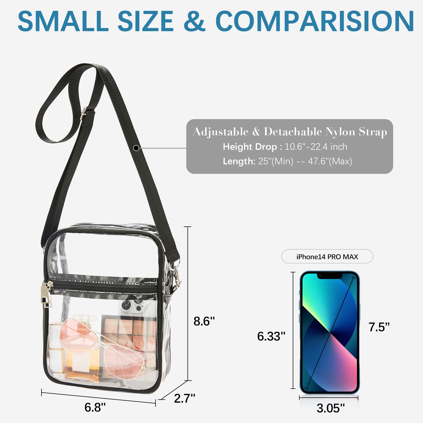 - 【Perfect Size with Roomy Pocket】-The clear bag is 9.1"(L) x 2"(W) x 6.9"(H) inch, And has 2 compartments with smooth zipper : 1 center main zip pocket is roomy enough for you to put your phone, wallet, cosmetics, snacks or other. 1 Front zipper pocket hold some item for frequent access, such as Sunglassed, keys or tickets.