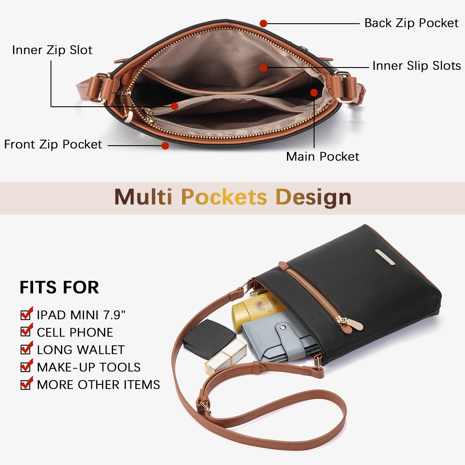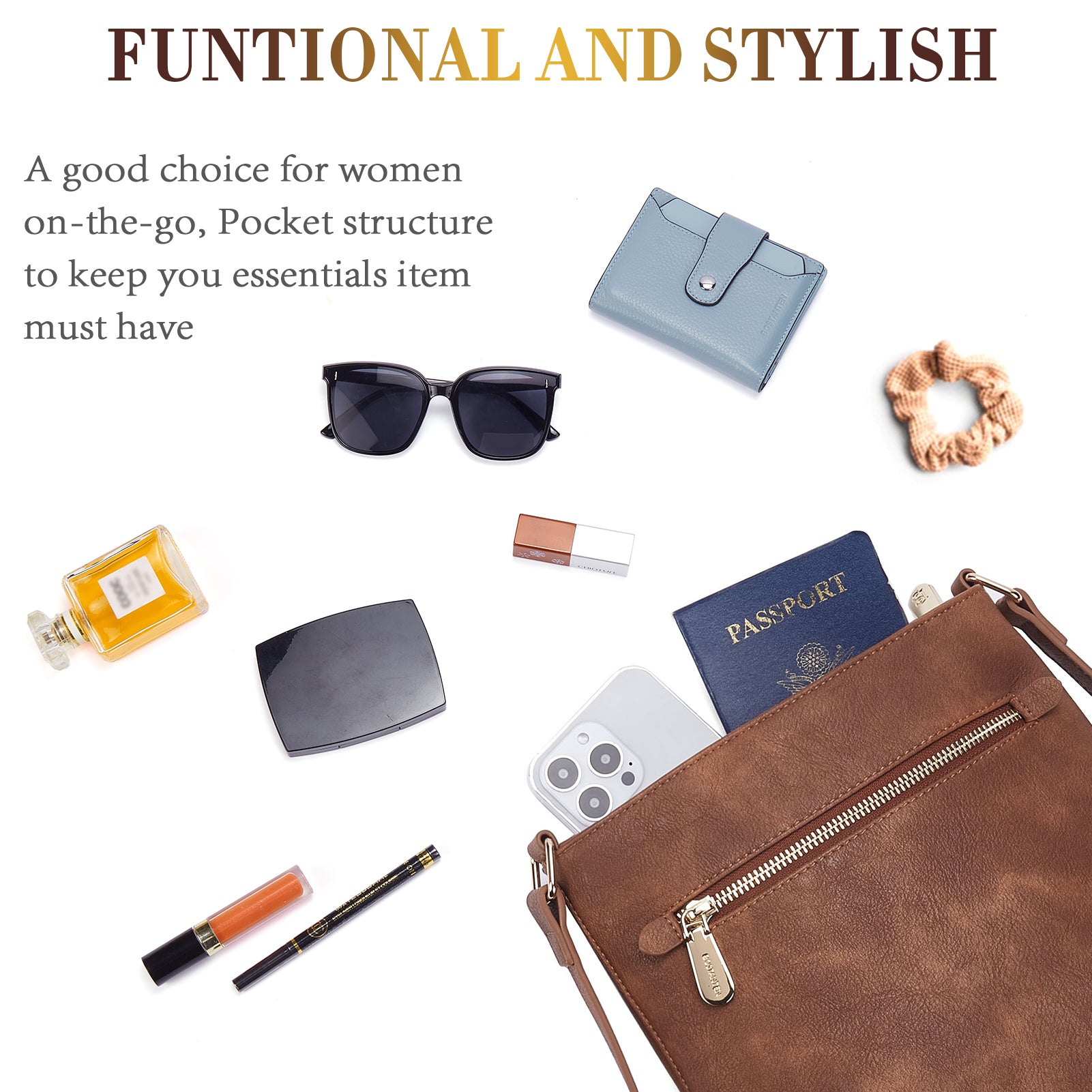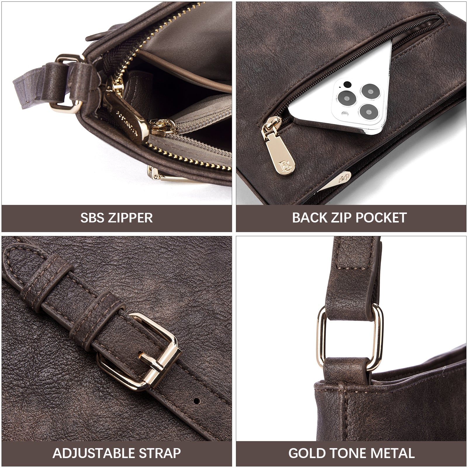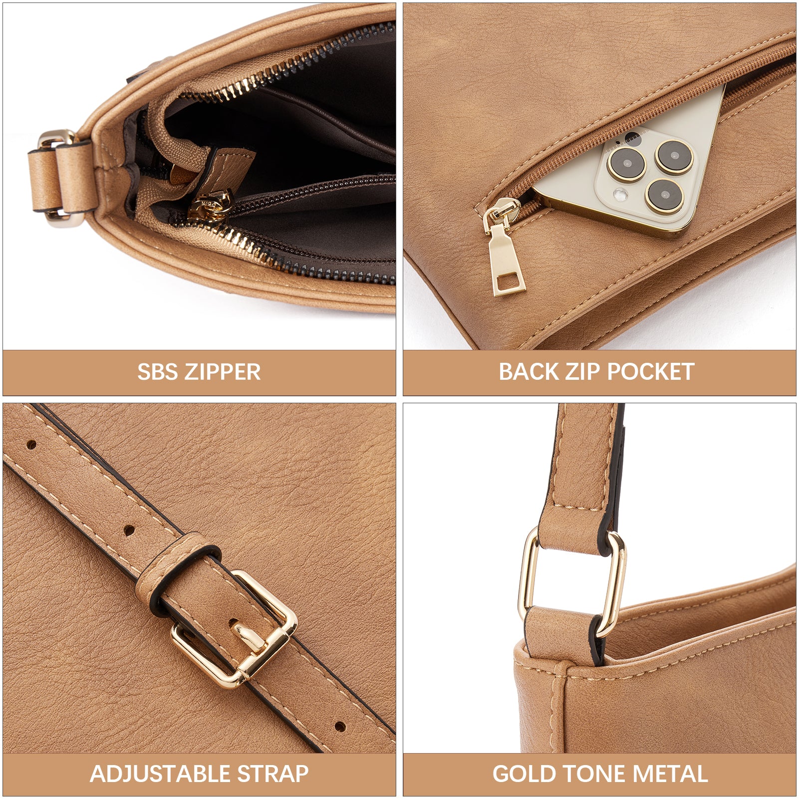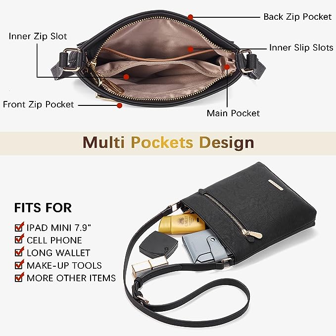 - Versatile Structure: a women’s purse needs are suitable compartment and look, Our cross body bags purses fulfills both. Interior including 1 main pocket + 1 slip slot + 1 zip pocket, Exterior with 2 zip pocket in front & back. You can well organize your cash, phone, credit card, makeup tool, mirror and more. And smooth zipper support you easy access both keep safety.