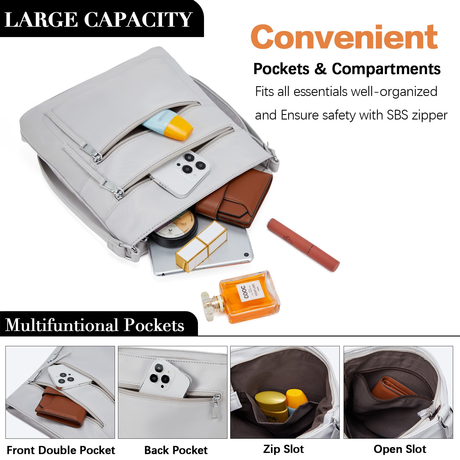 - Multiple Pockets Structure: Exterior with 2 front zipper pockets + 1 back zip pocket for passport or other; Interior main space has 1 zipper pocket + 1 open slot. Convenient pockets and compartments to easily fits essentials such as phone, iPad, wallet, keys, books and more. Zipper are better to help you keep items in good safe places.