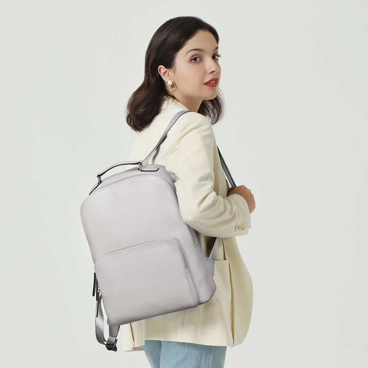 - DESIGNER: Carry handle for easy carrying in hand, this contemporary backpack includes a zippered stash pocket, a top pocket to hold valuables, and a front organizer to hold small items and personal accessories.