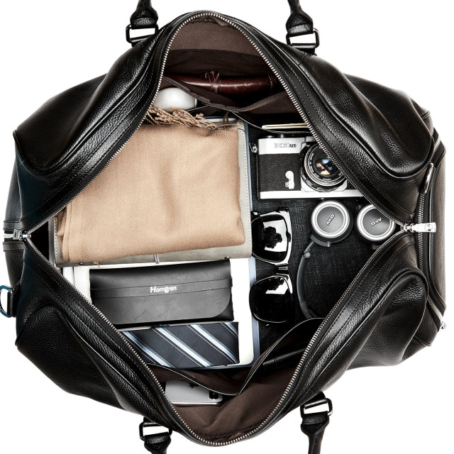 Different from colorful canvas gym travel bag, this one is made of supple genuine leather in black! Its looking is beyond your imagination and matches your personality. You can carry such an accessory with a casual or formal style you need to be on some special events, like, going traveling overseas, on cross-city business, doing outdoor sports, fishing by ponds, etc. Sophisticatedly designed and hand made, the duffle has greatly durable quality leather and zipper you don't need to worry during nice trips. Sturdy handles and padded shoulder strap make everything comfortable, and the roomy compartments make all your items concealed and safe.