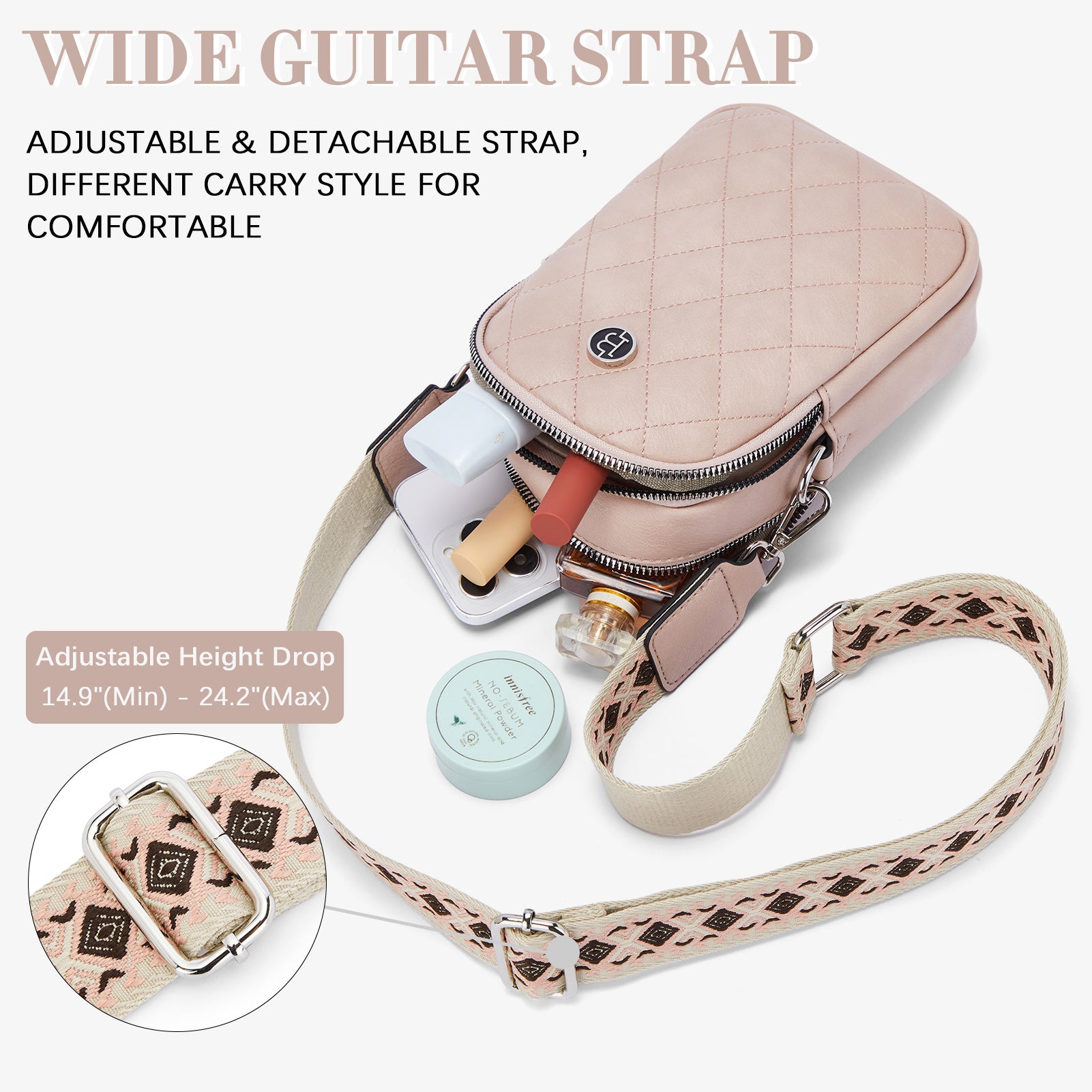 - Small & Lightweight Purses: Size 5.7"(L) x 2.95"(W) x 8"(H), Wide guitar strap height drop is 14.9"(min)--24.2"(Max).Roomy enough for most large phone and more items, Such as iPhone 14 pro max, key, lipstick, cosmetic, cards, etc. Also Offer versatile carrying style as a crossbody or shoulder bag.