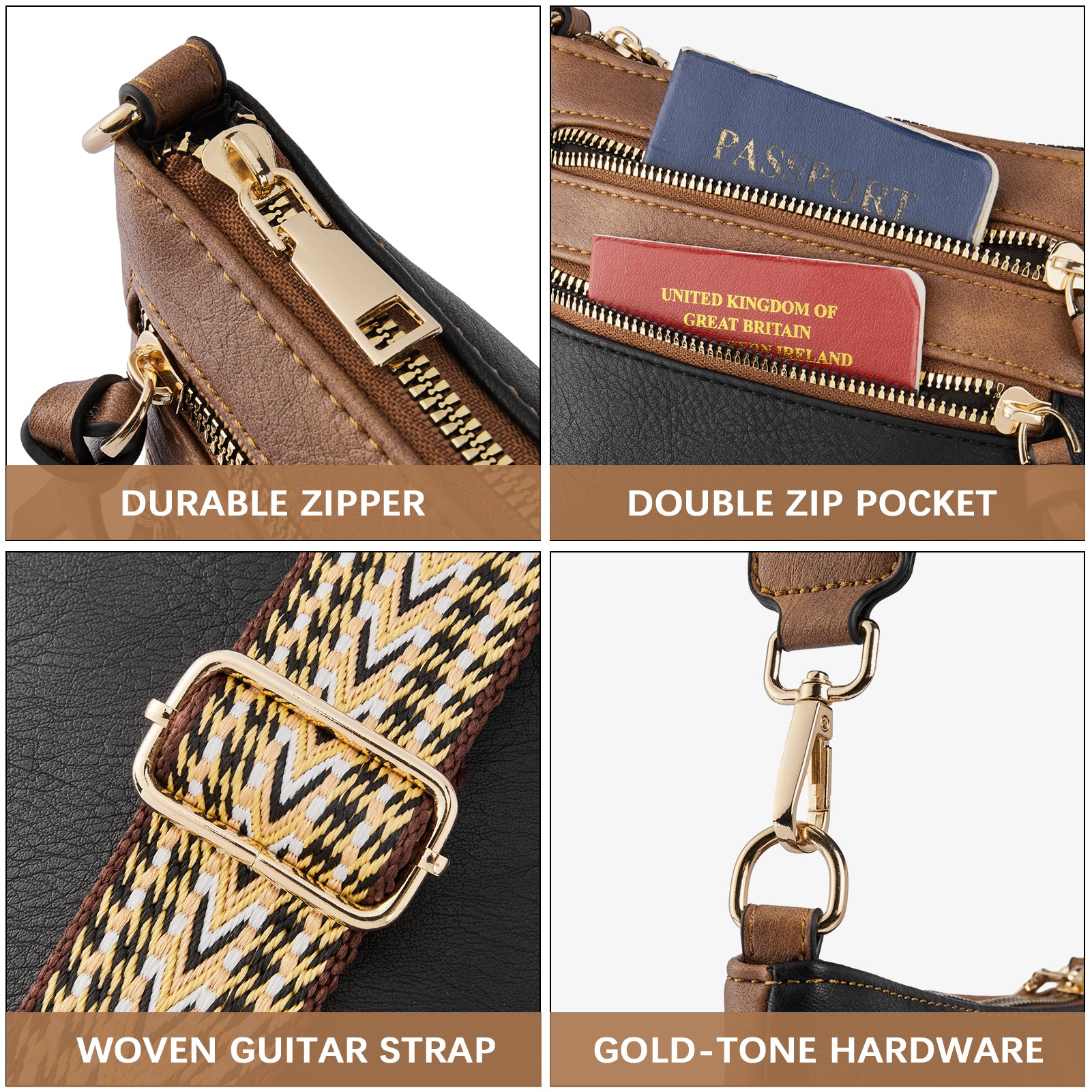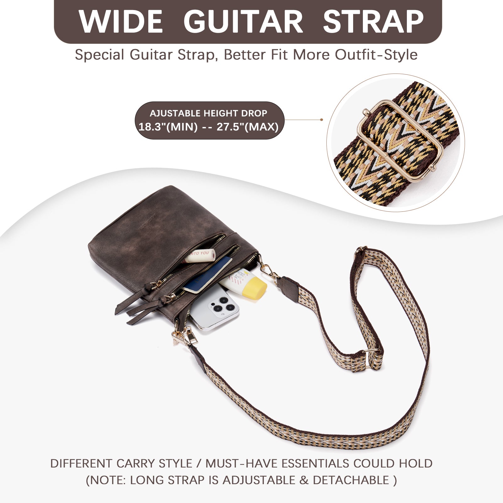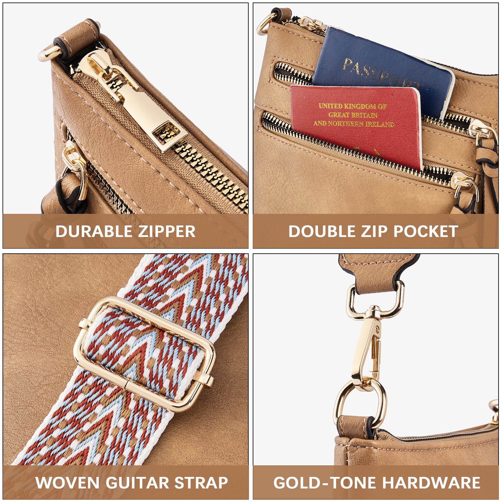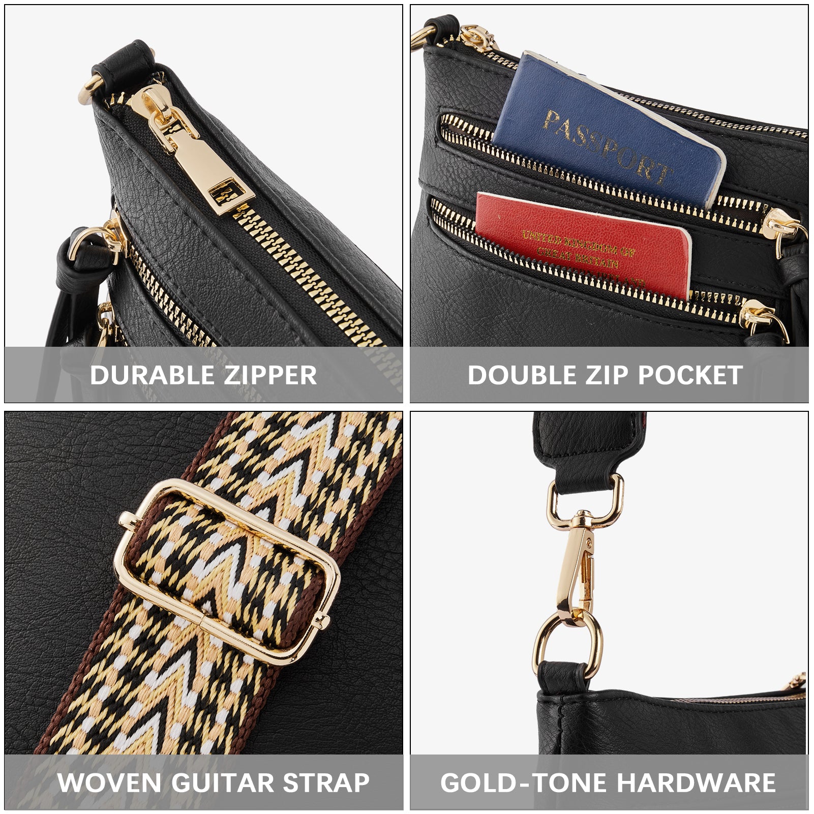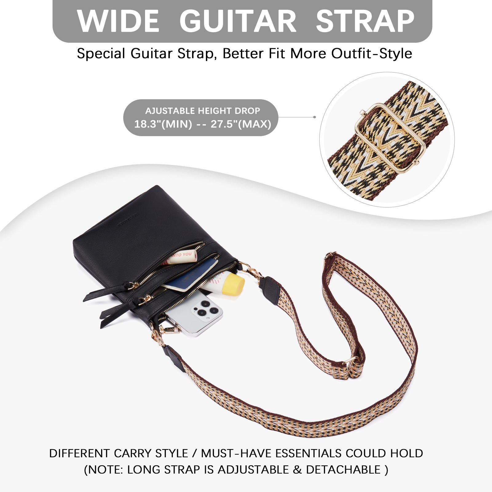 - Premium Cross Body Bag: This small crossbody bag designed for on-the-go style with Multiple zip pocket, Perfectly comes in handy! Made of durable vegan leather with a pretty guitar strap, More color to better fit more outfit styles and compliments your style sense! Gold-tone hardware & Smooth fabric interior show our sophisticated design.
