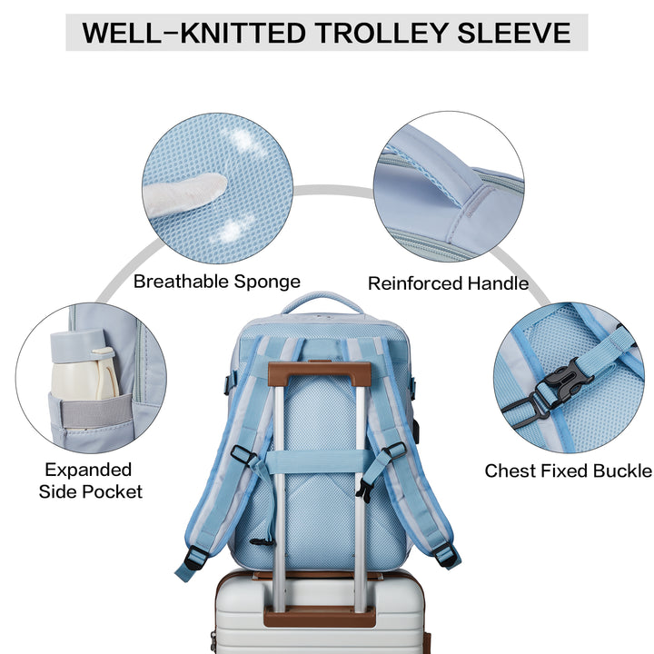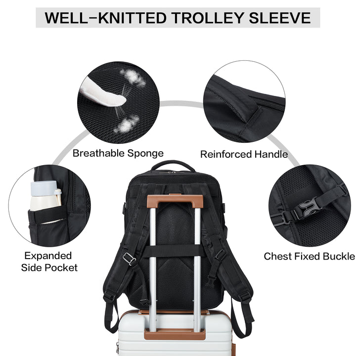 - ❖APPROVED BY MOST FLIGHTS--Approximate sizes (L) 12.59" x (W)4.72" x (H) 16.53" inches, 1.65 pounds. This personal item backpack meets the boarding requirements and can be opened and folded 180 degrees like a suitcase, which can quickly pass through airport security and is specially designed for plane travel. Well-Knitted Trolley Sleeve Free Your Hands.