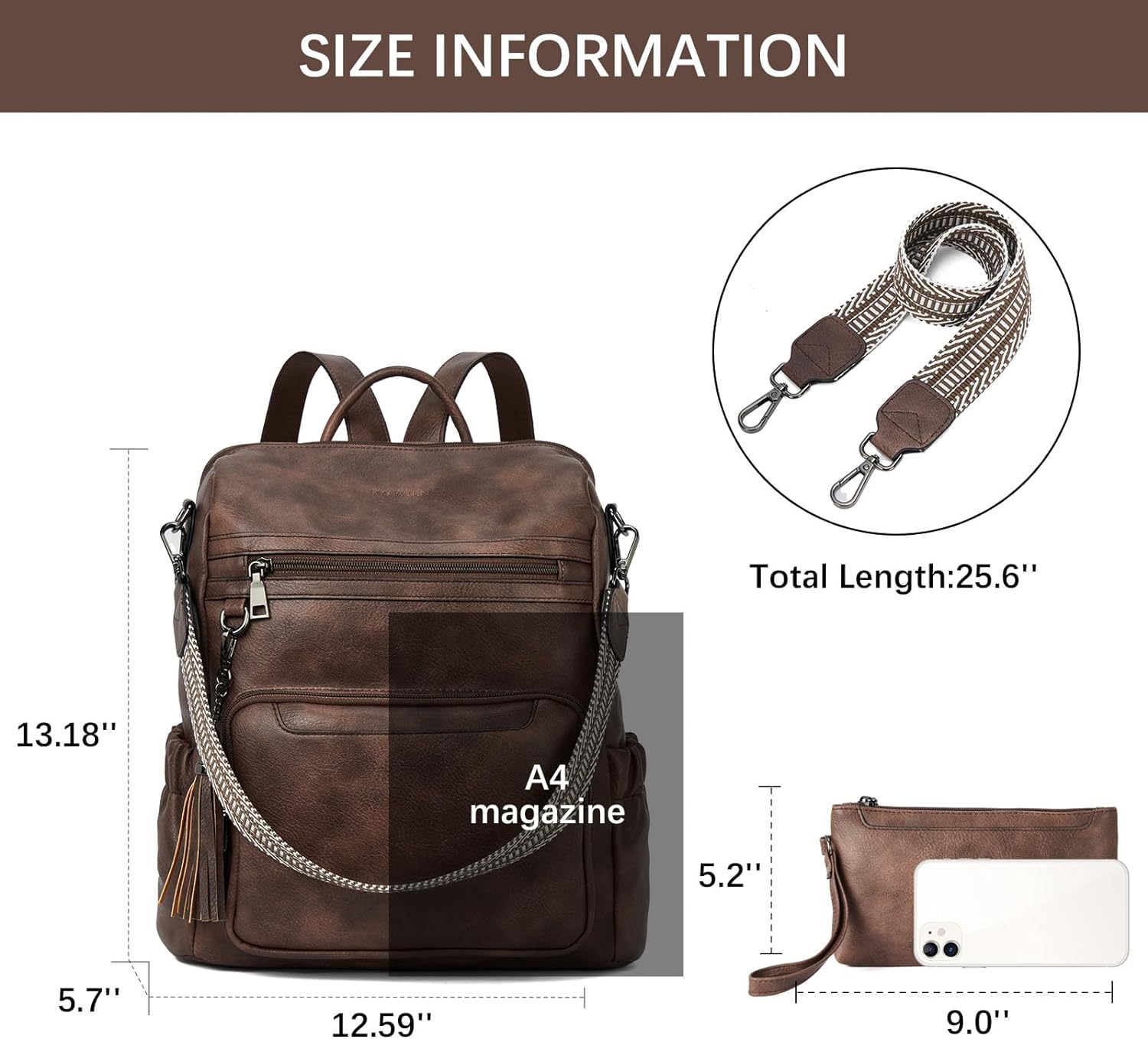 - DIMENSION -- Size: (L) 12.59 x (W) 5.70 x (H) 12.59 inches. Weight: 1.82 pounds. Wristlet: (W) 5.5 x (L) 8 inches. Detachable shoulder strap: 12". This Leather backpack purse comfortably holds a laptop 14" and under, iPads of all sizes, magazines, umbrellas, water bottles, and other small items. You can use it as an everyday backpack purse or as a travel backpack.