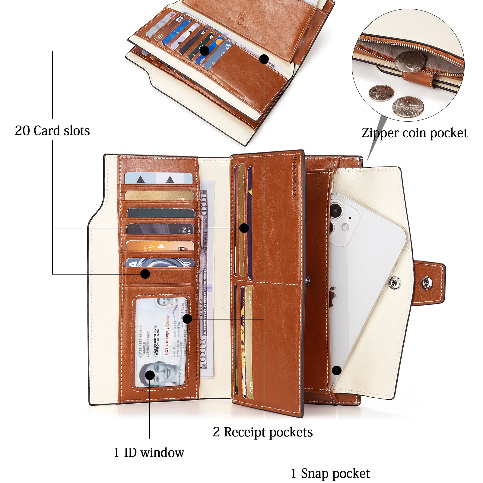 - Structure -- snap closure. 20 cards slots, 2 bill pockets, 1 ID window slot, 1 interior snap pocket and 1 rear zipper pocket. Functional enough to organize well mobile phone, cashes, credit cards, coins. etc. Built-in RFID blocking technology can keep away 13.56 MHz or higher signal disturbance!