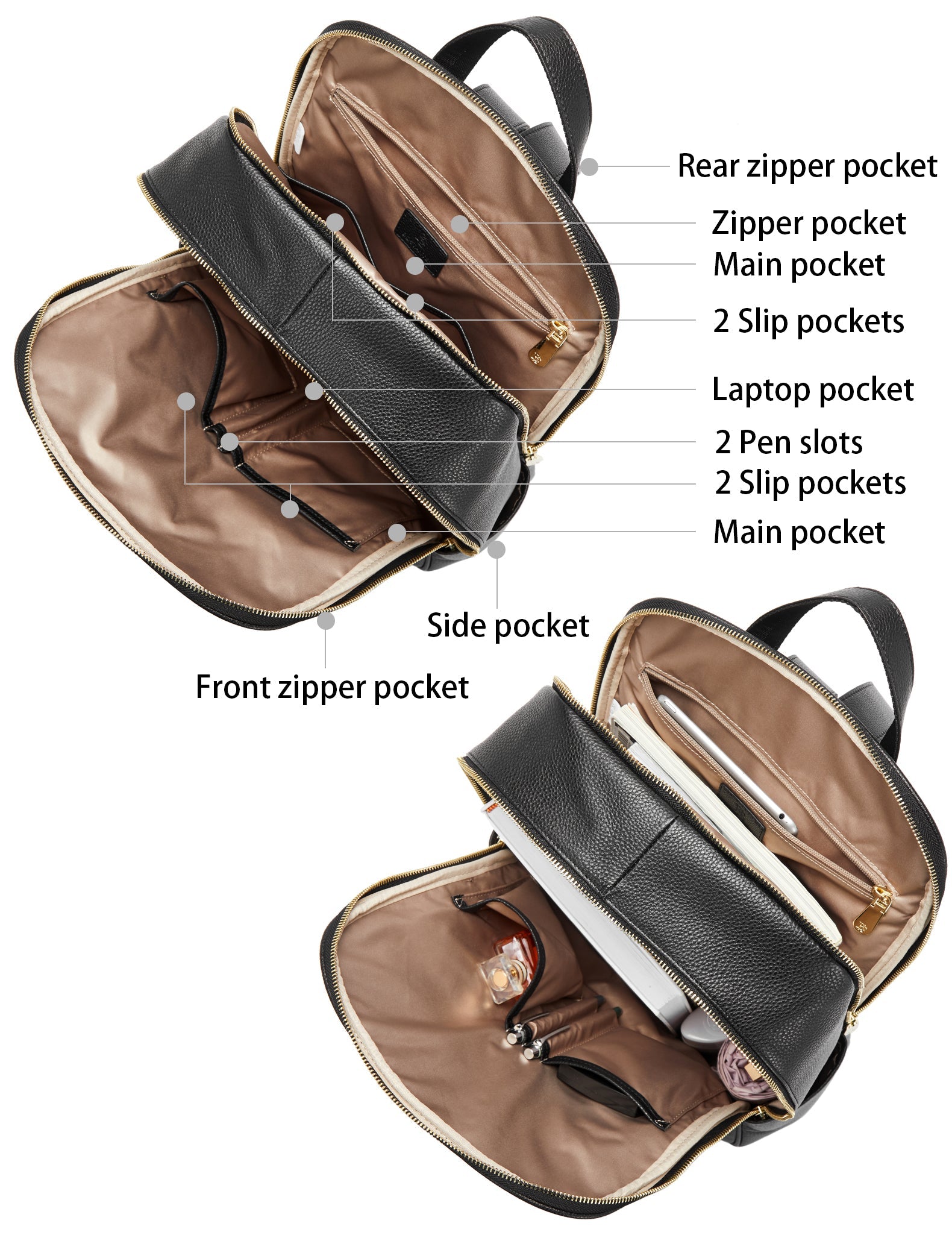 - Structure -- 2 main pocket,4 inner pocke,2 pen pocket,1 inner zipper pocket,1 laptop pocket,1 front zipper pocket,1 rear zipper pocket and 2 side pocket,so you can easy to access and store stuff.